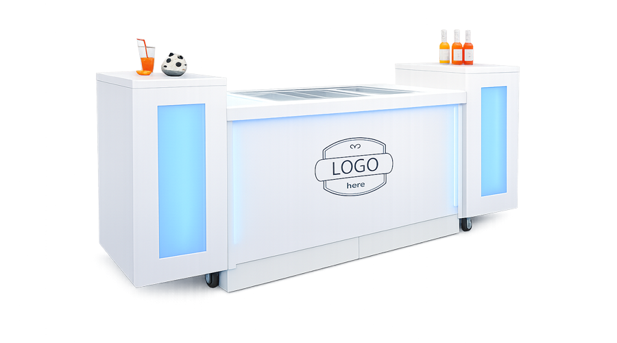 Deze ijsbar met ledverlichting die in elke kleur is in te stellen past perfect bij een gelegenheid in moderne stijl of beurs. Ook logo presentatie mogelijk in het midden van deze bar. Ook een kleinere variant va 140cm lengte en 80cm diepte beschikbaar.